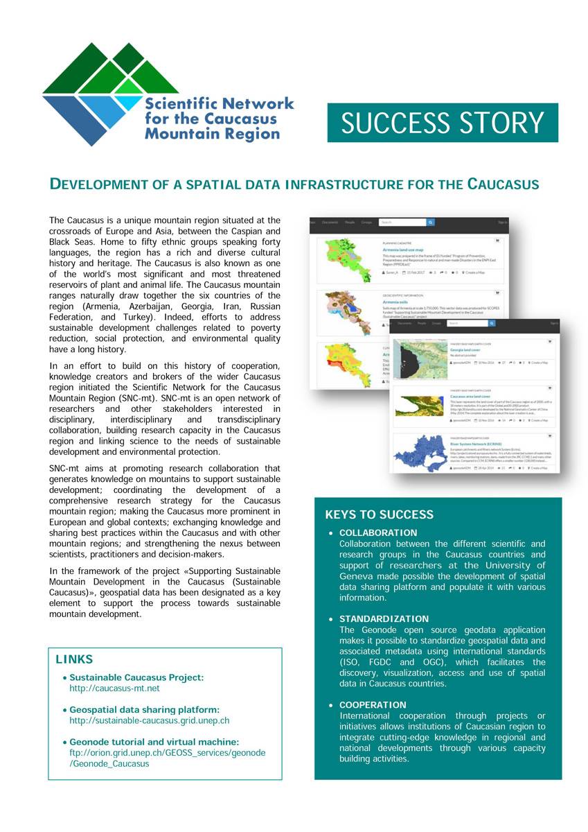 In the framework of the project «Supporting Sustainable Mountain Development in the Caucasus (Sustainable Caucasus)», geospatial data has been designated as a key element to support the process towards sustainable mountain development. In order to ensure the best access to and use of geospatial data for visualizing, monitoring and modeling specific issues, an open source geospatial data sharing platform has been set up using the Geonode application (//geonode.org).