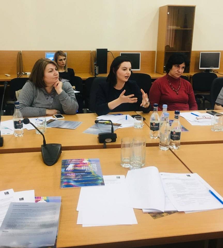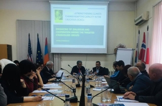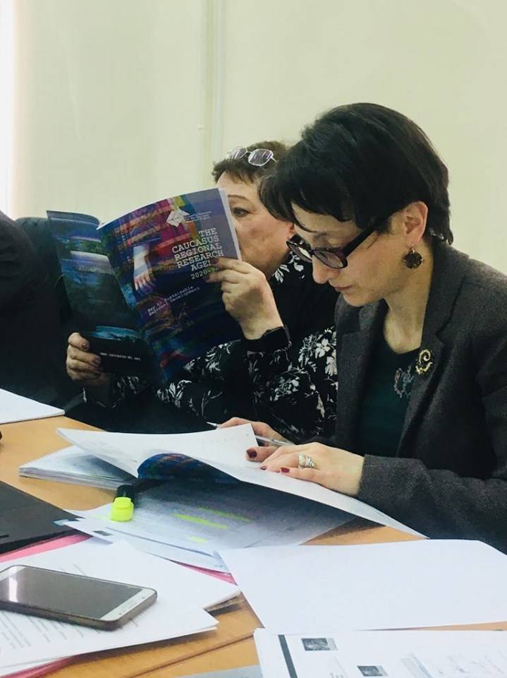 Meeting participants were introduced to the project “Strengthening the Climate Adaptation Capacities in the South Caucasus (SCAC)” and its main components, as well as activities undertaken such as results of the second Caucasus Mountain Forum (CMF 2019) and the Caucasus Regional Research Agenda (C-RRA), Preliminary Assessment of the Situation of Higher Education and Risk Mapping in DRM and Higher Education in Disaster Risk Reduction. The audience, mainly including potential National Initiative Group (NIG) Armenia members, was provided with the presentations about Advocacy Roadmap and the Caucasus Regional Research Agenda (C-RRA).