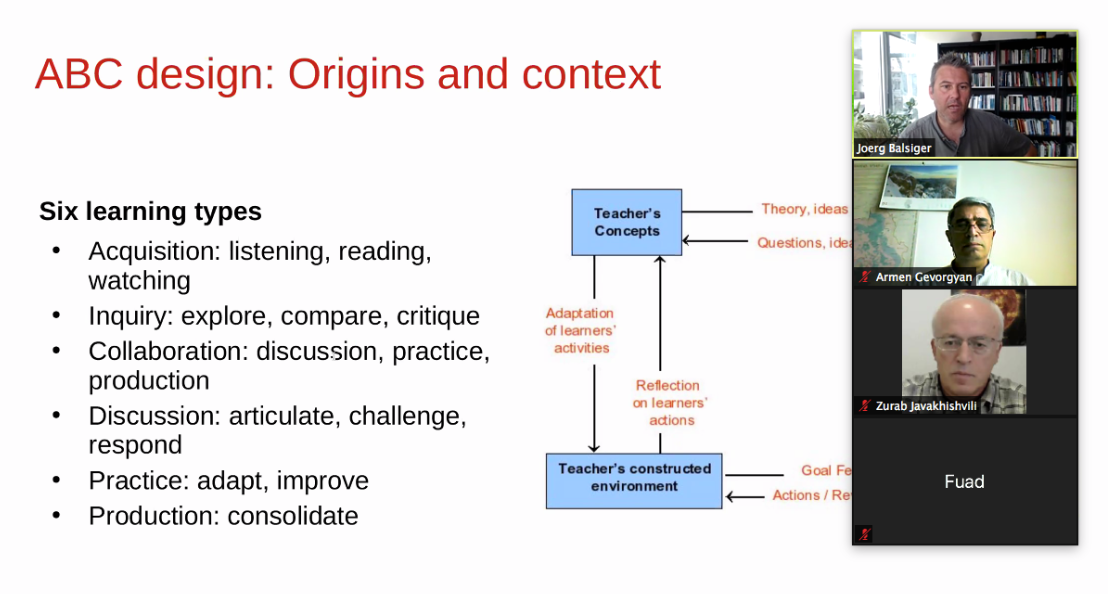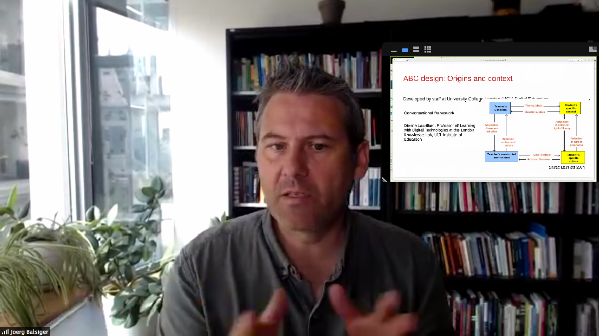 Professor Jörg Balsiger introduced ABC Learning Design which is a highly successful curriculum development approach conceived at University College London in 2014. The approach is designed to allow teaching teams to design a course in just 90 minutes by means of a structured approach using specialized tools and a visual storyboard; it can also be used to review and modify an existing course or to plan a change into an online course.